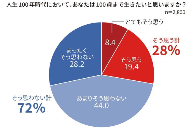 ――高齢化が進む中で日本における100歳以上の人口は増え続け、2022年には90,526人と過去最多を突破しました。その一方で御社の100年生活者調査では「100歳まで生きたい」と考える人は28%にとどまっています。長生きをしたいと思う人が多くないのはなぜなのでしょうか。