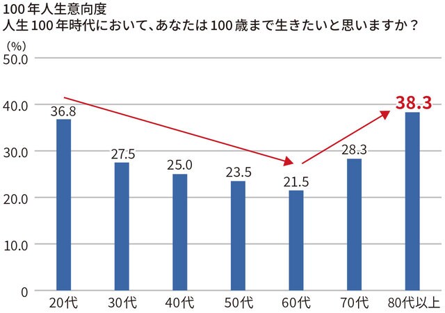 【大高】100歳まで生きたいと思うかについては、年代によってはっきりと傾向が異なることが分かっています。「100歳まで生きたい」と思う人は20代で36.8%と高く、30代からは下がり続けて60代で底を打ち、70代以降は再び上昇して80代以上が38.3%と最も高くなっています。特に40代~60代で低いのは、それまで描いていた人生とのギャップが大きいせいかもしれません。60歳くらいまで働いてその後は引退して悠々自適と思っていたのに、急に「あと40年もある」と言われてしまい、戸惑う人は多いでしょう。
