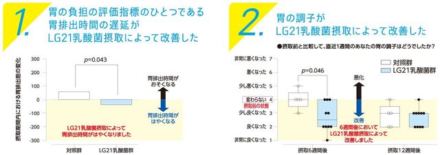 「LG21乳酸菌」は、同社独自の乳酸菌研究の中で、胃に着目して選び抜かれた特別な乳酸菌です。酸に対する耐性が高く、強い酸性条件下である胃でも生存して増殖することが可能であり、さらに胃細胞への付着性が高いという、胃内環境において個性的な特長を持っているとのこと。そのような特長から、一時的な胃の負担をやわらげる機能が報告されています。
