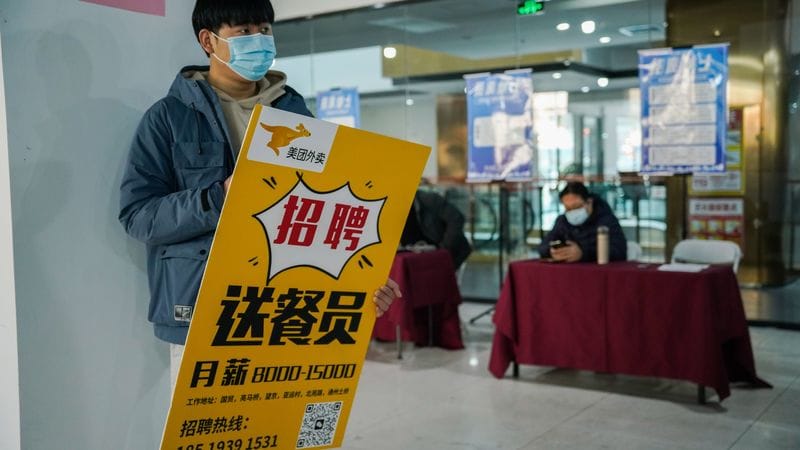 2023年2月24日、中国・北京で開催されたジョブフェアで、マスクをつけた男性が求人広告を手にする。中国人力資源・社会保障部は、新型コロナの制限により過去3年間オンラインになっていたが、2月に全国で数百のジョブフェアを開催すると発表した。