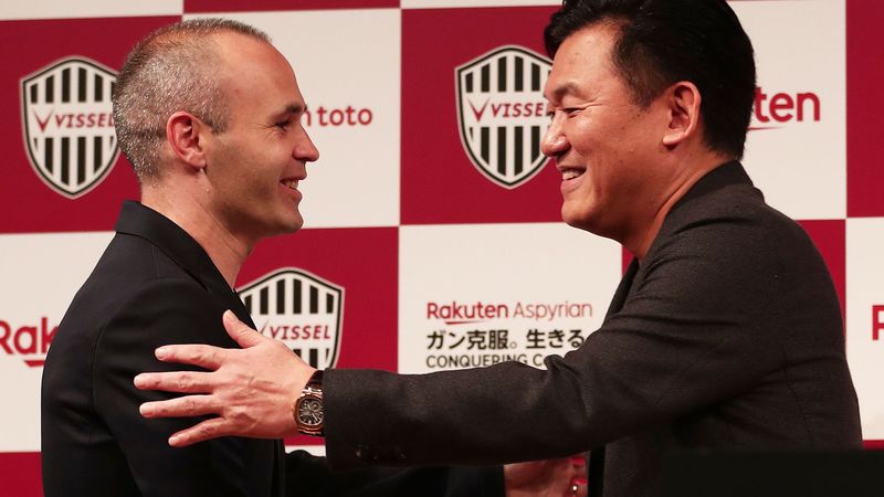 2018年5月24日、東京都内で行われた記者会見で握手するスペインサッカー界のスター選手アンドレス・イニエスタ(左)と楽天とヴィッセル神戸のクラブオーナーである三木谷浩史氏。