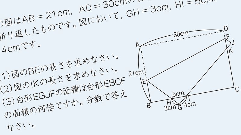 長方形を折り曲げてできた図形で、相似な直角三角形を見つけることがポイントですが、当時は、「こういう相似の探し方があるのか」と驚嘆したユニークな問題でした。