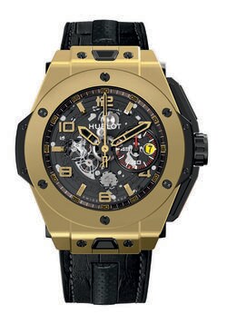 昨年11月に結ばれたフェラーリとのパートナーシップによって誕生したコレクション。ダイナミックなデザイン、9時位置にあしらわれた跳ね馬、自社製ムーブメント「ウニコ」搭載と魅力に事欠かないが、中でも先進的なのがマジックゴールドと呼ばれるケース素材。ゴールドとセラミックから生成されるこの素材は、18Kゴールド認定を受けながら優れた硬度や耐傷性を誇る。技術的先端を走る両社の協力関係を象徴するような素材だ。