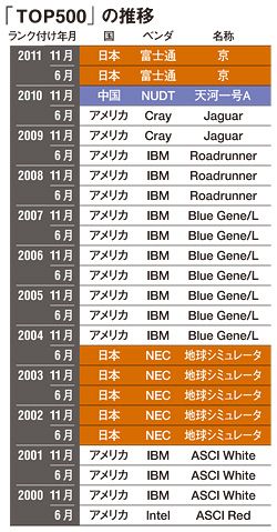 世界のスパコンランキング「TOP500」では、年に2回、6月と11月に世界最速のスパコンを発表している。11年6月同ランキングで「京」が、演算速度世界最速記録を達成して“世界最速”という称号を手に入れた。そして同年11月にも世界最速を記録し、2004年にNECが「地球シミュレータ」で世界一になって以来7年ぶりの快挙であった。