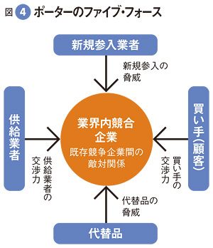 業界の環境を分析するフレームワークとして、マイケル・E・ポーターが提唱したファイブ・フォース分析がよく知られている。ポーターは業界の魅力度を「新規参入の脅威」「買い手の交渉力」「供給業者の交渉力」「代替品の脅威」「既存競争企業間の敵対関係」という5つの競争要因で分析した(図4)。