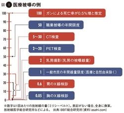 図1はさまざまな医療被曝の例である。100ミリシーベルトの放射線を受けた場合、ガンによる死亡率が0.5%増えると「推定」される。ガンによる死亡率が1万分の1だとすれば、その0.5%、つまり1000万分の5、死亡率が高くなるわけだ。それもほとんど推測の領域の話である。これが100ミリシーベルトの被曝をすることの現実だ。