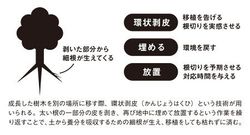 樹木を移植する前に、まず根元の太い根の一部分の皮をぐるりと剥きます(環状剥皮)。ふたたび土中に埋めて放置すると、剥いた部分から細根が生えてきます。これを何度か繰り返すと、根元にたくさんの細根が生えてきて移植に耐えられるようになります。この一連の作業を根回しといいます。