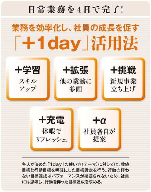 「週休2日+1day」は、週のうち5日かけて行っていた通常業務を効率化して4日に収め、それにより生まれた1日を自己啓発に充てるという勤務制度だ。「+1day」の使い方については各人がテーマを設定し、上長の承認を得ることが必須。学習系のテーマにトライする場合は、年間20万円まで費用を出す制度も併設した。