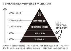 マズローの欲求の5段階は、すべてリアルで満たすことが可能です。一方、ネットで満たせるのは第3段階の「社会的親和の欲求」より上の欲求であり、生理的欲求や安全・安心の欲求といった身体的・本能的な欲求は満たせません。換言すると、ネットは人間の高次の欲求を満たすのに適したシステムといえます。