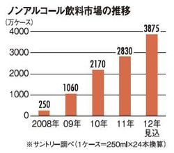 ノンアルコール飲料の勢いが止まらない。サントリーの調べによると、2012年のノンアルコール飲料市場は、約3875万ケース(対前年比137%)と、4年前の15倍以上の規模に成長する見込みだ。