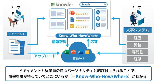 パーソナルアシスタントサービスの「knowler」は、AIを活用したナレッジシェアの仕組みです。従来のシステムと大きく異なるのは、ドキュメント情報に加え、“一緒に働く人の業務内容や知見”なども共有できること。必要な情報を持っている人がどこにいるのかが可視化され、それをAIが適切にレコメンドしてくれます。