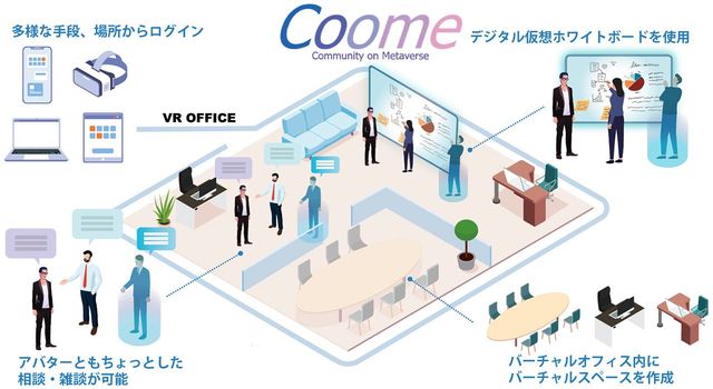 【遠藤】XR分野の「Coome」では、メタバースオフィスを提供します。従来のオフィスでは当たり前に行われていた気軽な相談や報告をテクノロジーの力でサポートするのが狙い。リモートワークによる孤独感の解消にも有効です。メタバースというと、エンタメ分野のイメージが強いですが、私たちはこれをビジネスの世界でしっかり使えるものにしていきたい。そう考えています。