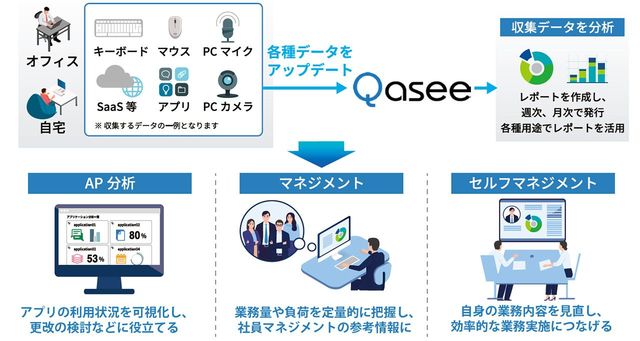 そしてウェルビーイング関連では、音声データを基に従業員のメンタル状態を数値化する「MIMOSYS」、業務中のPCの操作やアプリの使用状況のデータを収集し、それを分析、レポートする「Qasee」を提供しています。