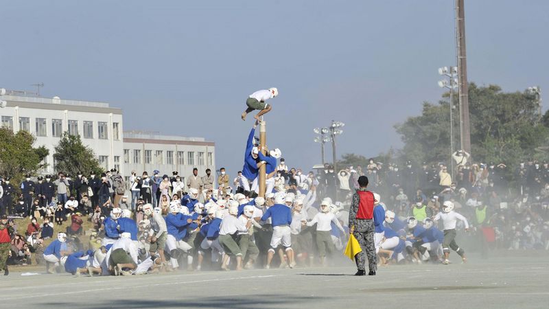 棒倒しは4個大隊(1〜4大隊)の学生舎ごとにチームが分けられ、毎年11月に行われる開校記念祭にて「1発勝負のトーナメント方式」で競技が行われます(開校記念祭とは学園祭のようなもの。一般の方も来校可能です)。