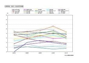 2009年のリーマンショック、2011年の東日本大震災と、ネガティブな時勢の影響を心理的に最も受けやすいのがこの層のようだ。全体にそこでデパートの利用が落ち、買い控え傾向が見える。また新宿、横浜の百貨店が上位を占め、銀座、日本橋、渋谷方面では百貨店を利用しなくなっている傾向が見てとれる。