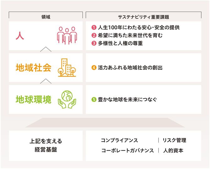 次世代に持続可能な地球環境を継承するためには、生命保険事業としてお客さまに安心・安全をお届けするとともに、より積極的に社会へ働きかけ、インパクトを与えていくことが重要だと考えます。そこで2023年4月、事業を通じた企業価値向上と持続可能性へのさらなる貢献を目指し、サステナビリティ経営に関する取り組みを企画、統括する組織として「サステナビリティ企画室」を新設しました。私たちがやるべきことを分かりやすく社内外に発信するために、活動を一層高度化させる体制を整え、サステナビリティ重要課題を再整理し「人」「地域社会」「地球環境」の3領域で取り組んでまいります。