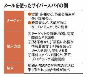 昨年末、日本では衆議院や各省庁など様々な公的機関や大企業がサイバー攻撃に遭い、組織内のPCから侵入される事件が多発した。サイバー空間を使ったスパイが世界中で暗躍している。冒頭の例以外にも、ソーシャルメディアなどを活用した情報収集、ビッグデータの悪用、掲示板サイト等における大量の架空人物を使った煽動などの活動が挙げられる。