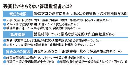 労働基準法は、労働者の労働時間や休日に関して規定を設けている。ただ、管理監督者はそうした規定の適用が除外されている(労働基準法41条2号)。つまり管理監督者には法定労働時間の枠がなく、何時間働いても時間外労働にはならない。