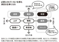 自分を満足させるための仕事(自分満足)は、「やりたいか、やりたくないか」で判断できます。一方、他人を満足させるための仕事(他人満足)は「まわりから必要とされているか、されていないか」という視点で判断できます。この2つの切り口を軸にして整理すると、仕事は9つのカテゴリに分類できます。
