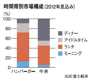 その理由を、調査に当たった同社東京マーケティング本部の上田周作氏は「厳しいシェア争いのなかで低価格が定着するかたわら、モーニングメニューの充実といった企業努力がユーザーを取り込んでいるからだ」と説明する。実際、ハンバーガーショップも牛丼店も朝から利用客が立ち寄っており、ハンバーガーセットにしても朝定食でも500円でおつりがくる。