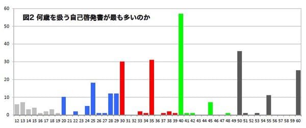 「年代本」は20代を扱うものが最も多かったのですが、では「○○歳」という特定年齢を扱うものの場合(「年齢本」と呼ぶことにします)、一体何歳が最も多いのでしょうか。先程と同様に、『国立国会図書館サーチ』の件名「人生訓」で、タイトルに「12歳」から「60歳」までが含まれている書籍を集計したものが図2です。
