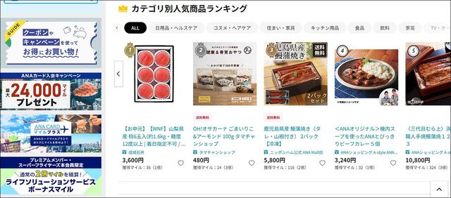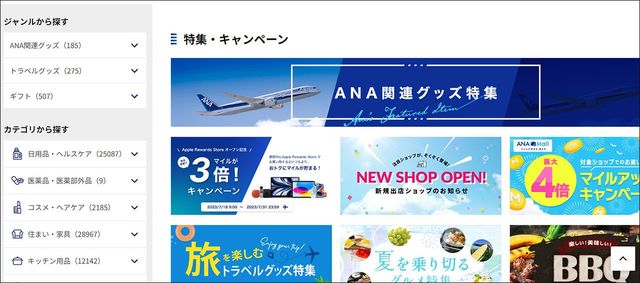 1マイル1円相当で使え、買い物に応じてマイルを貯めることもできる「ANA Mall」。ANA関連グッズ、トラベルグッズの他、ギフト、日用品、家具、家電など、多種多様な商品を取りそろえる。ユーザーへワクワク感を提供するさまざまな特集・キャンペーンも魅力だ。トップページでは最新の人気商品も一目で確認できる。