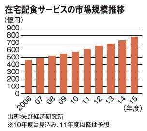 調理済みの食事を自宅へ配達してくれる「宅食」サービスが確実に成長している。矢野経済研究所では、2006年に463億円だったピザや外食チェーンなどの宅配を除く「在宅配食」の市場が、15年には775億円に達すると予想する。9年間で約1.7倍という堅調な推移の背景にあるのは、高齢者人口の増加だ。足が悪い、近くに店がないなどの理由で買い物にいけない人や、料理ができない人にとって、温めるだけ、あるいは適温で供される食事はありがたい。栄養バランスのよさやメニューの豊富さなども魅力だ。