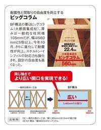 一方、「梁勝ち」を採用した「BF構法」では、横架材としての梁を柱より優先させる形となっており、各階ごとに、使い勝手に合わせて柱や窓の位置を決めることができる。つまり設計自由度、間取りの自由度が高いのだ。