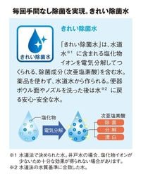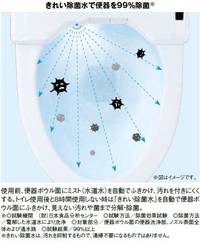 この「きれい除菌水」をトイレに使用する毎、また8時間使用しないときに自動で便器ボウル内にふきかけることで、目に見えない汚れを99%分解、除菌し、トイレのきれいを長持ちさせる。