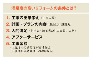 3番目は人的満足度。営業担当者はもちろんのこと、施工する職人たちの態度や気遣いも、実は満足度に大いに影響を及ぼします。リフォームは在宅で行う場合が多く、この点が新築と異なる点です。