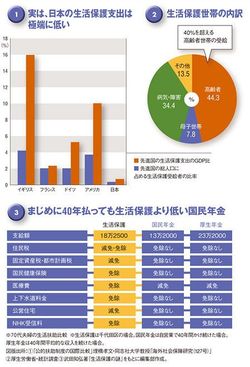 一方、夫が平均的収入のサラリーマンで、40年間厚生年金を払い続けたとします。すると、厚生年金と夫婦の老齢基礎年金を合わせた額は、月に約23万円程度です。生活保護でも年金生活とそれほど遜色のない生活が送れるのです。