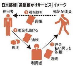 通帳預かりサービスとは、通常貯金の払い戻しを依頼したいとき、郵便配達人に通帳を預ければ、顧客に現金と通帳が届けられるというサービスである。顧客にとっては、郵便局にいかなくてもカネを届けてもらえるというメリットがある。郵政公社時代にはそもそも可能だったこの仕組みは、民営化後一部過疎地でのみ実施されていた。今回の日本郵便発足を機に、事業化したということである。