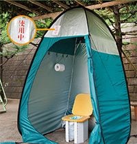 簡易トイレを使用する場合、公共の場を個室化できるテントがあれば便利なのでご紹介する。「ベンリーテント」(ケンユー)は軽くて手軽に持ち運べ、ワンタッチで簡単に広げられる。内部がシルバーコーティングのため、透けて中が見えることがほとんどないのも安心できる。