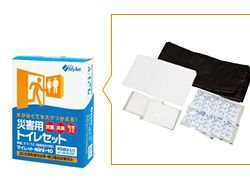 プラスチック段ボールを使った便器は重さ約800グラム。軽くてコンパクトなので、心もとない気がしたが、座ってみるとソフトで心地よく、なかなか落ち着く。上部静止耐圧が約300キログラム、座る程度の動耐圧は約150キログラム。吸水性ポリマー入りの汚物処理袋がセットになっているが、市販のポリ袋と凝固剤を使用してもよい。デザインもなんとなくキュートで、愛知県警や自衛隊でも採用されている。
