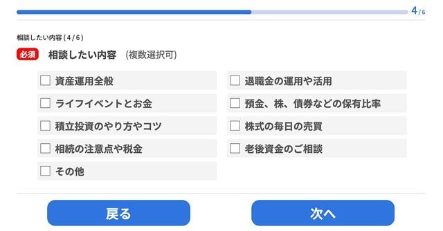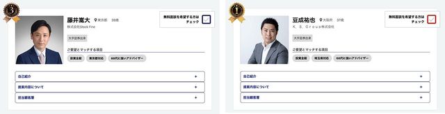 使い方はいたって簡単。専用フォームに年齢、居住地の都道府県、性別、職業、金融資産額、相談したい内容などを入力すると、約60秒で利用者の希望にマッチしたアドバイザーが一覧で表示される。面談を希望する場合は、その画面からダイレクトに申し込める。