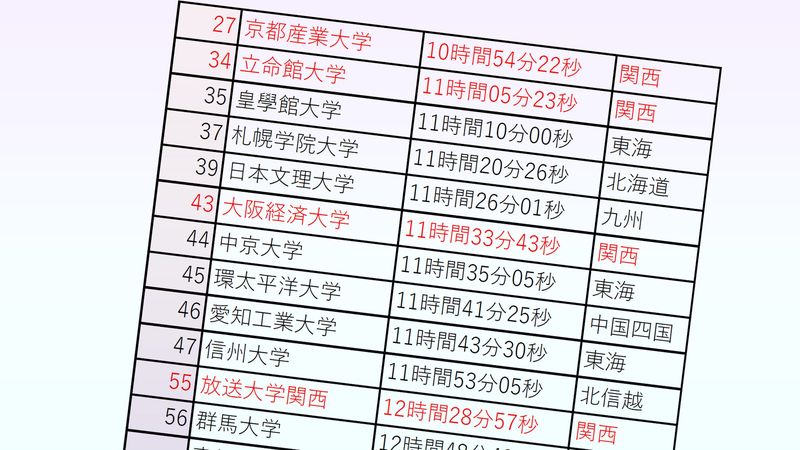 地方勢の最高位は京産大の27位(10時間54分22秒)で、次が立命大の34位(11時間05分23秒)。個人成績では小嶋郁依斗(京産大3)の46位(1時間03分07秒)が最高だった。なお今回の予選通過ラインは10時間39分47秒。京産大ですら14分35秒も引き離された。1人あたりでいうと、ハーフマラソンで1分27秒もの開きがあった。