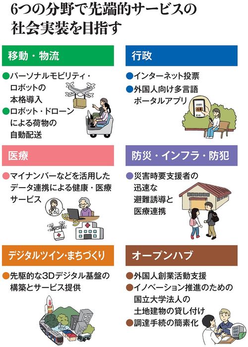 【五十嵐】つくば市が抱える問題は、大きく「都市と郊外の二極化」「多文化共生の不備」「都市力の低下」の三つですが、実はこれらは多くの都市に共通する問題といえます。つまり、ここから派生する地域課題を解決することは、日本全体にとって意味を持つ。そこで私たちは、つくば市の特徴である大学・研究機関の科学的な知見を取り入れながら、企業や住民とも連携して、移動・物流、行政、医療など6分野(左図参照)で先端的なサービスの展開を進めていく予定です。