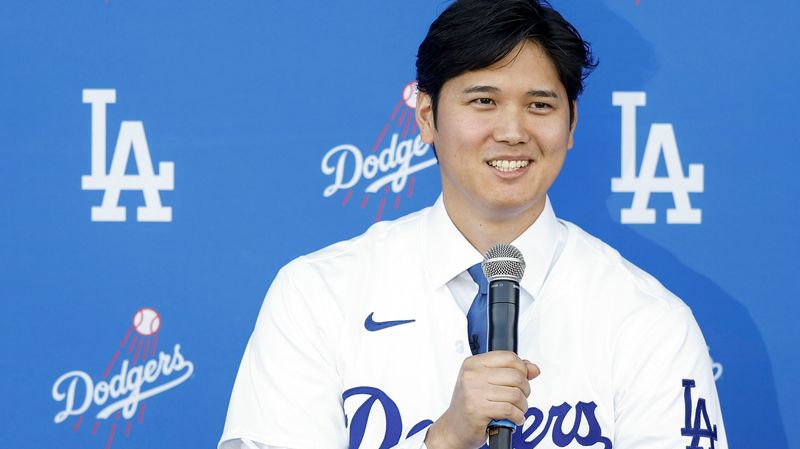 2023年12月14日、米カリフォルニア州ロサンゼルスで入団会見に臨むロサンゼルス・ドジャースの大谷翔平選手。大谷選手は先日、球団と10年契約で7億ドル(約700億円/6億3600万ユーロ)を契約し、球界史上最高年俸選手となった。