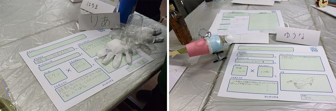 そうして完成した未来の「あったらいいな」の設計図を基に、用意された画用紙や紙コップ、ストロー、ボタン、輪ゴム、針金など、さまざまな資材を用いてモノづくりをし、最後に子どもたちは前に出て順に発表していった。
