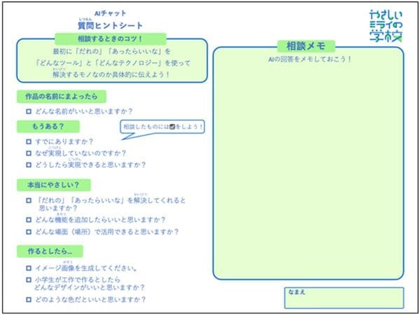 また、子どもたちはAIチャットに相談することもできる。例えば未来の「あったらいいな」の名前は何がいいだろうか? 考えてみたけれど、既にあるものだろうか? それは本当に「やさしい」のだろうか? 作るとしたらどんなデザインがいいのだろうか? そんなことをAIに聞くことで、子どもたちがAIに触れて体験できることも狙いとなっている。