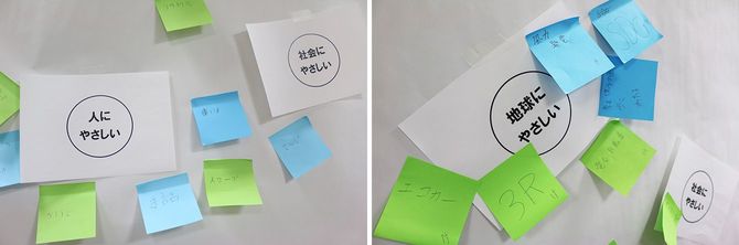 子どもたちが付箋に「やさしいと思うもの」を書き、それをボードに貼り付けていき、「やさしい」を再確認するのだ。そして、「やさしい」と「未来の暮らし」をつなげて考え、それを実際に作ってみる、というワークショップの意図が説明された。