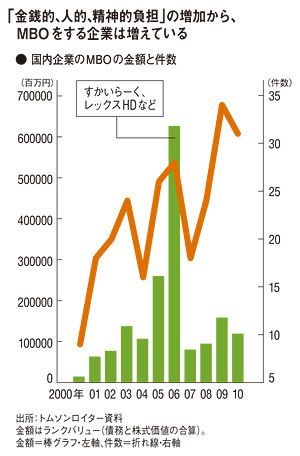 MBO(Management Buy-Out)とは経営陣や従業員が自社株を買い取ったり、事業譲渡を受けて会社の経営権を手に入れることです。MBOで経営権を握り、上場廃止で株式を非公開化するのは、従来は敵対的買収からの防衛策とされていました。しかし06年のワールドの上場廃止を皮切りに、経営のフリーハンドを高めたいという意味合いから、上場の意義を問い直し、MBOによる上場廃止を選択するケースが近年は増えてきました。