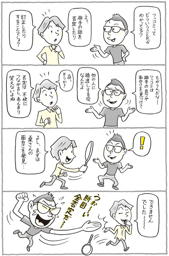 マスターすべきは、ツッコミの「フレーズ」や「間」や「テクニック」ではありません。通訳して橋渡しをするという「ツッコミマインド」なのです。このツッコミマインドをマスターしておけば、相手を不快にさせる失礼なツッコミをすることもありません。さらには、ツッコんだ相手から喜ばれます。