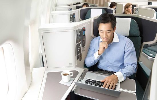 機内サービスも世界最高峰の誉れが高い。とりわけ評価が高いのは、香港発の長距離路線用の機材に順次導入が進む新しいビジネスクラスである。シートは全長208cmのフルフラットベッドになり、ベッドの幅もクラス最大級。収納スペースも豊富で、小物類、靴などが座席まわりにすっきり収まる。座席配列は1-2-1の横4席のみ。座席はプライバシーを守るソロ仕様だが、中央の2席は互いにやや向き合うように配置され、同行者のいる旅行に最適だ。各座席には、電源コンセント、およびUSBポートやiPhone/iPodコネクターなどを備えたマルチポートコネクターも装備され、機内が“オフィス”になる。快適性と機能性が大幅に向上した新しいビジネスクラスは、2012年のスカイトラックス社ワールド・エアライン・アワード(*4)において「ワールド・ベスト・ビジネスクラス」賞に輝いた。