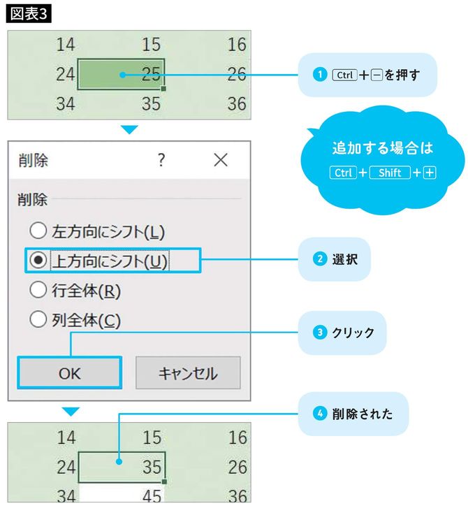 基本的なショートカットのほか、セルや行/列を削除・追加するショートカットも便利です。