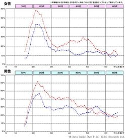 ※ビデオリサーチ社が約30年に渡って実施している、生活者の媒体接触状況や消費購買状況に関する調査「ACR」(http://www.videor.co.jp/service/media/acr/)の調査結果を元に同社と編集部が共同で分析。同調査は一般人の生活全般に関する様々な意識調査であり、調査対象者は約8700人、調査項目数は20000以上にも及ぶ。