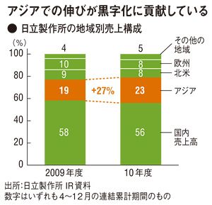 そうした状況下で、日立が活路を見出したのは海外です。セグメント情報で「国内・海外の売上高」を見てみると、10年度第3四半期までの連結の国内売上高は約3兆7800億円。前年同期比で104%です。一方、海外売上高は約2兆9800億円と金額では国内売上高に及ばないものの、前年同期比は113%。