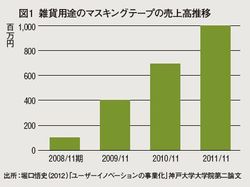 彼が持ってきたのはマスキングテープの用途革新の事例だ。消費者が日常生活でマスキングテープを使う新しい用途を考えつき、メーカーに伝えたのだが、ほとんどのメーカーがその用途の事業化を行わなかった。結果として、うち1社が事業化し発売後4年で20億円の小売市場が誕生したそうだ。製品を最初に市場に投入したカモ井加工紙(以下、カモ井:岡山県倉敷市)は当該市場でOEMを含めた約9割のシェアを占め、同社全体の売り上げの1割以上を当該用途向けで稼ぐようになっている。カモ井以外のマスキングテープ・メーカーは有望な市場の存在を消費者から知らされながらも自社に取り込むチャンスを逃がしてしまったのだ。