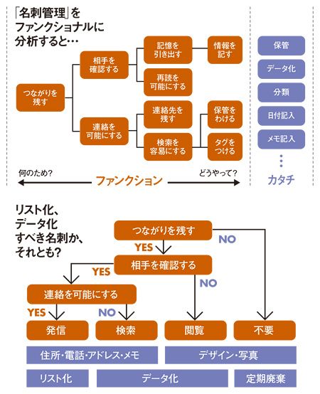 名刺管理を効率化したければ、まずファンクションを把握すべきです。名刺管理には「保管」「データ化」「分類」といったカタチがあります。これらの目的を突き詰めていくと、名刺管理は「相手を確認する」「連絡を可能にする」という2つのファンクションに集約され、それらの目的もそもそも「つながりを残す」というファンクションを達成するためだとわかります。