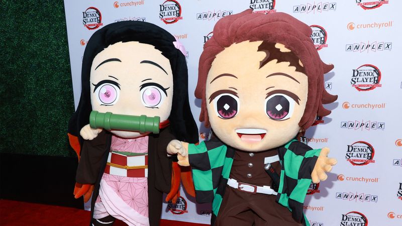 クランチロール「デーモン・スレイヤー」のレッドカーペット・プレミアに出席した竈門禰豆子(左)と竈門炭治郎=2023年2月18日、カリフォルニア州ロサンゼルスのThe Orpheum Theatreにて。